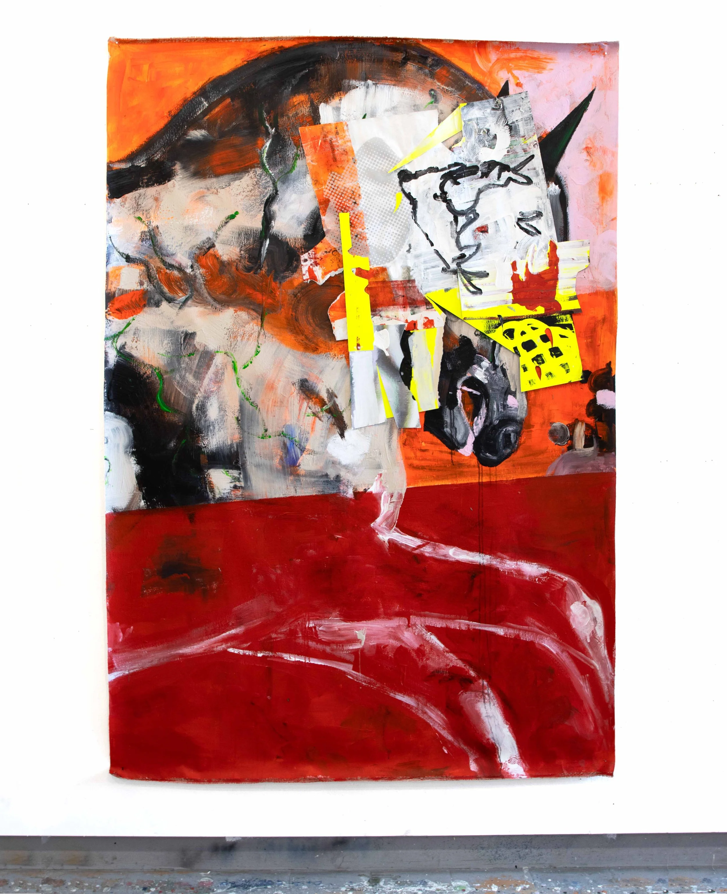 Acrylic and paper collage on linen canvas, 220 x 170 cm